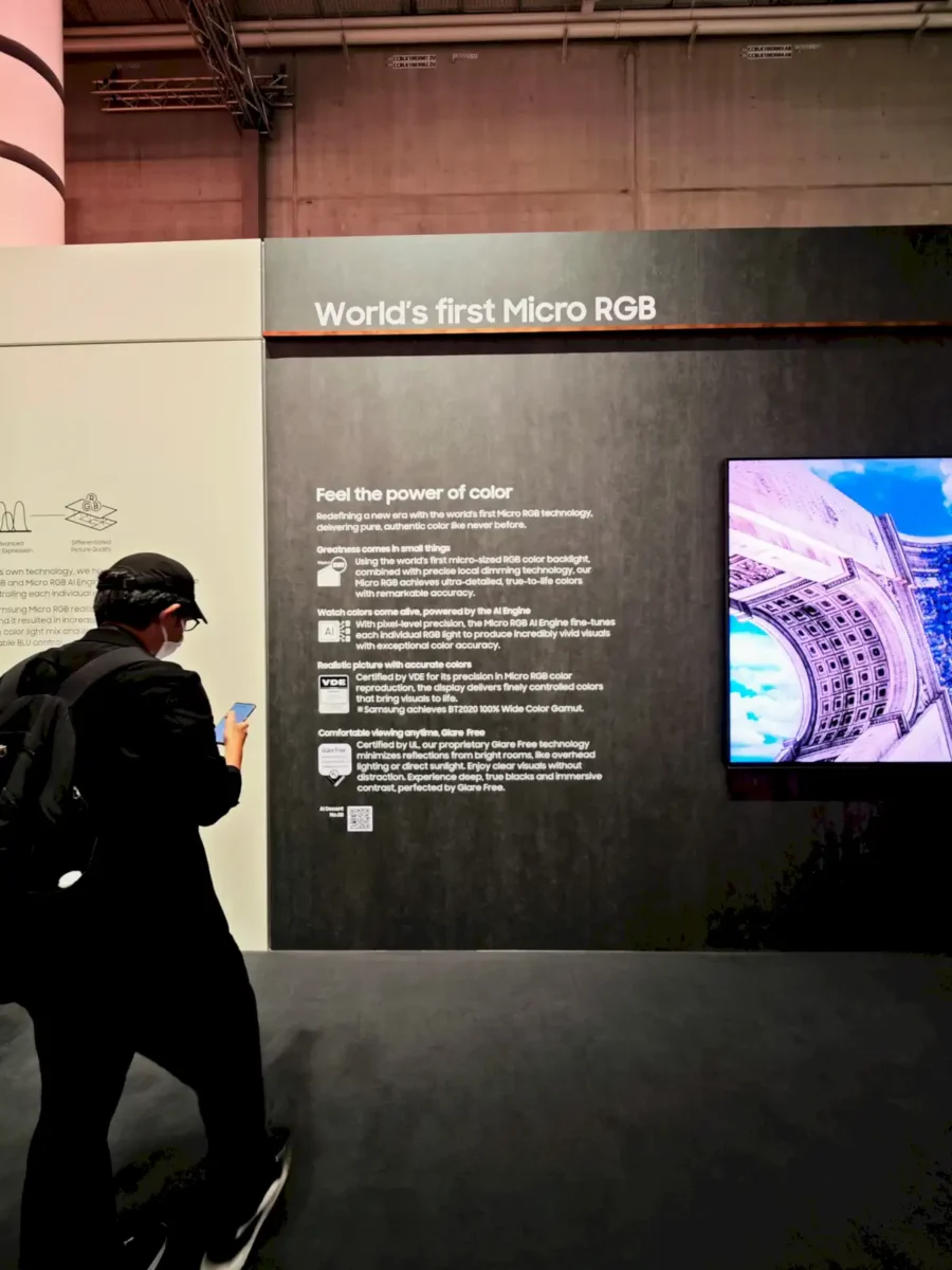 Στις μεγάλες οθόνες, η Samsung παρουσίασε την πρώτη παγκοσμίως Micro RGB τηλεόραση 115 ιντσών, η οποία χρησιμοποιεί LED λεπτότερα από ανθρώπινη τρίχα για την απόδοση ακριβών χρωμάτων και εικόνας. Ενσωματώνει επίσης τεχνολογία χωρίς αντανάκλαση (glare-free), μειώνοντας δραστικά τις αντανακλάσεις ακόμη και σε έντονα φωτισμένα περιβάλλοντα.