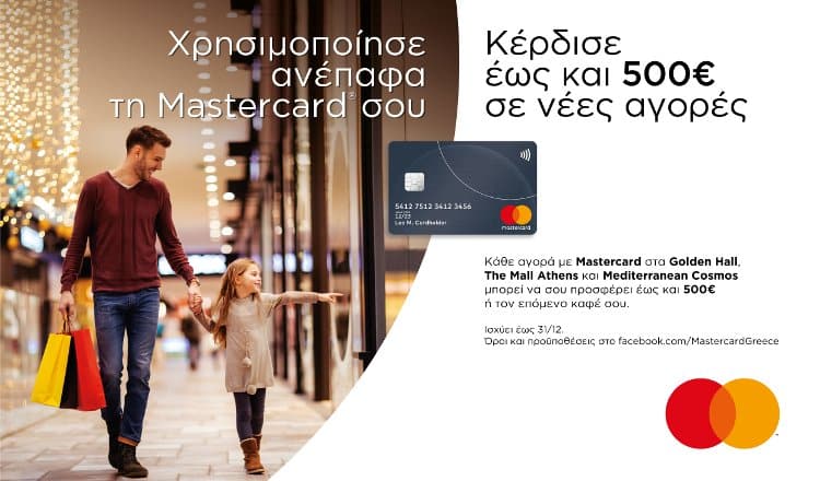 Η Mastercard συνεργάζεται για 2η συνεχή χρονιά με τα εμπορικά κέντρα Golden Hall και The Mall Athens στην Αθήνα, καθώς και το Mediterranean Cosmos στη Θεσσαλονίκη για να προσφέρει στους κατόχους των καρτών της τη δυνατότητα να κερδίσουν δωροεπιταγές αξίας έως και 500€ ή τον επόμενο καφέ τους.