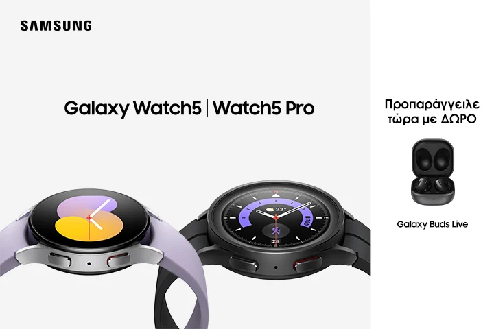 Οι καταναλωτές μπορούν να προ-παραγγείλουν επίσης, το νέο Samsung Galaxy Watch 5 | Watch 5 Pro, από 299,90€ και σε 12 άτοκες δόσεις που καλύπτει τις καθημερινές ανάγκες του χρήστη, από την άθληση μέχρι τον ύπνο και την παρακολούθηση των καρδιακών παλμών, ενθαρρύνοντας έναν πιο υγιή τρόπο ζωής. Προ-παραγγέλνοντας το νέο smartwatch της Samsung, οι καταναλωτές παίρνουν δώρο τα Samsung Galaxy Buds Live, στο χρώμα της επιλογής τους, μέσω της εφαρμογής Samsung Members.