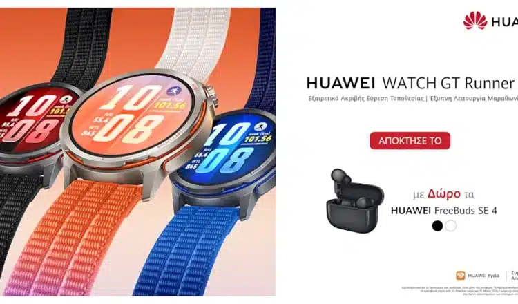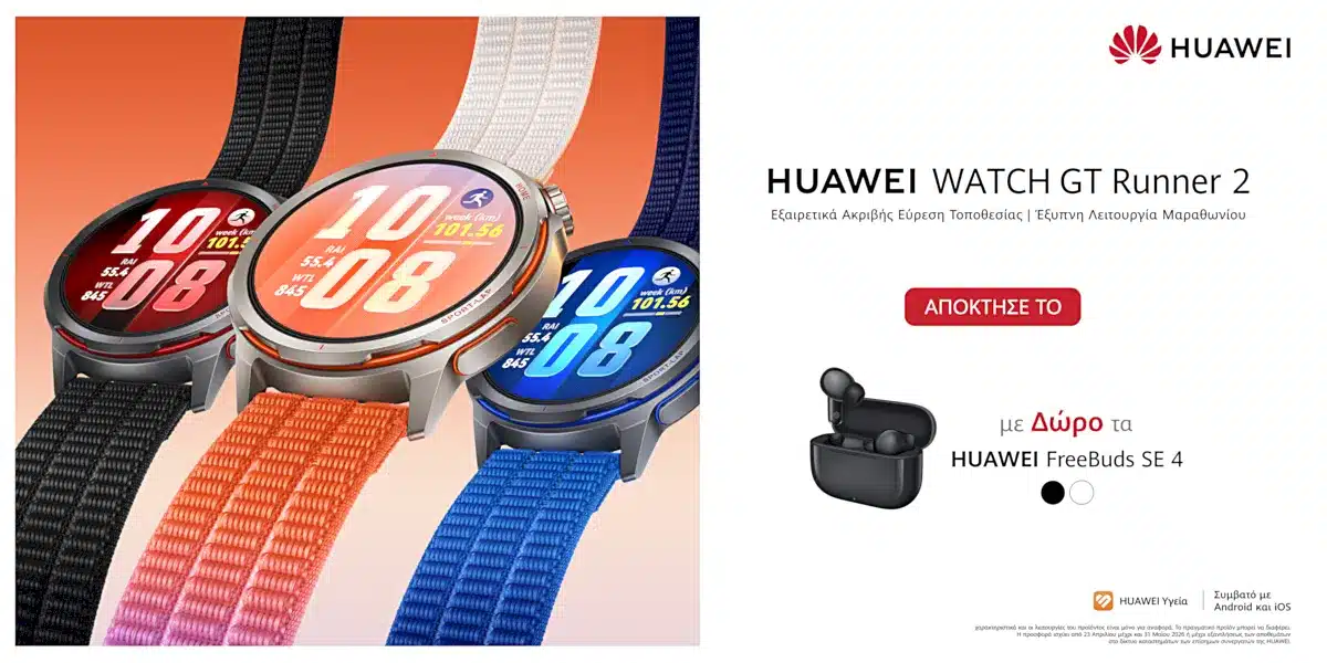 Το HUAWEI WATCH GT Runner 2 είναι διαθέσιμο στην Ελλάδα από 23 Απριλίου 2026 με δώρο τα FreeBuds SE 4 στο δίκτυο καταστημάτων των επίσημων συνεργατών της Huawei. Ανακαλύψτε τη νέα εποχή στα επαγγελματικά smart wearables και χαρίστε στον εαυτό σας ένα εργαλείο που θα σας συνοδεύει σε κάθε διαδρομή!