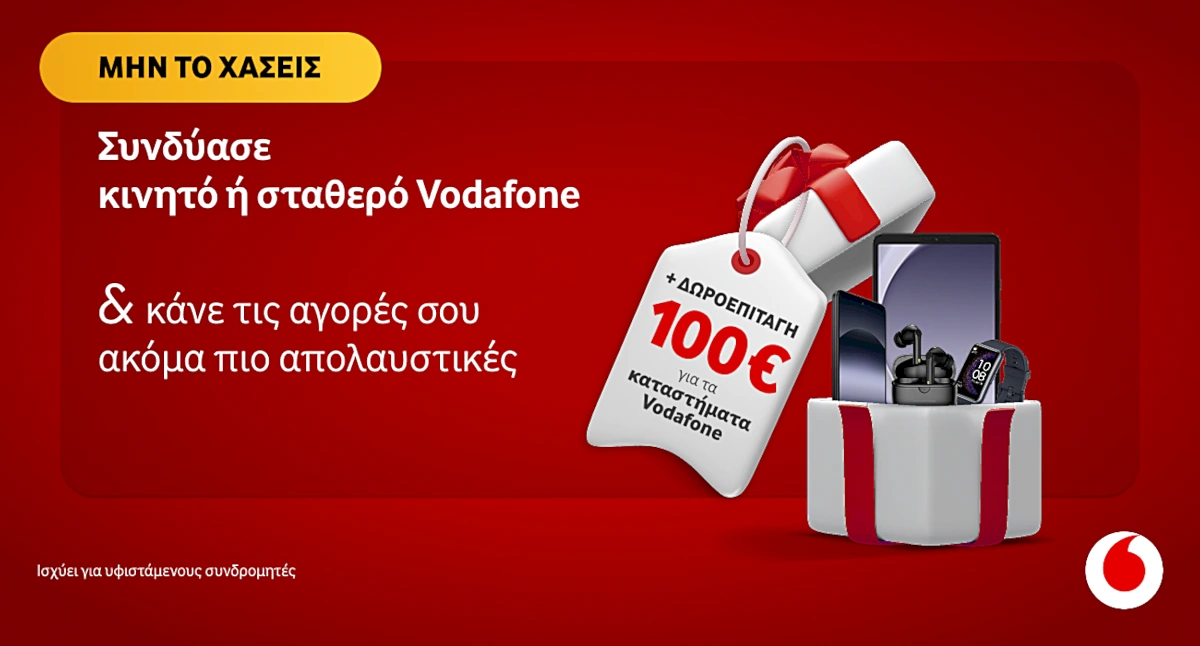 Αποκλειστικά για τον Νοέμβριο η Vodafone δίνει τη δυνατότητα σε όλους τους υφιστάμενους συνδρομητές της να αποκτήσουν ένα μοναδικό δώρο. Από σήμερα και έως την 1 Δεκεμβρίου, όλοι οι ιδιώτες πελάτες συμβολαίου κινητής και σταθερής Vodafone που θα αποκτήσουν μία επιπλέον γραμμή κινητής ή σταθερής, θα λαμβάνουν δωρο-επιταγή αξίας 100€ για αγορές προϊόντων τεχνολογίας από τα καταστήματα Vodafone.