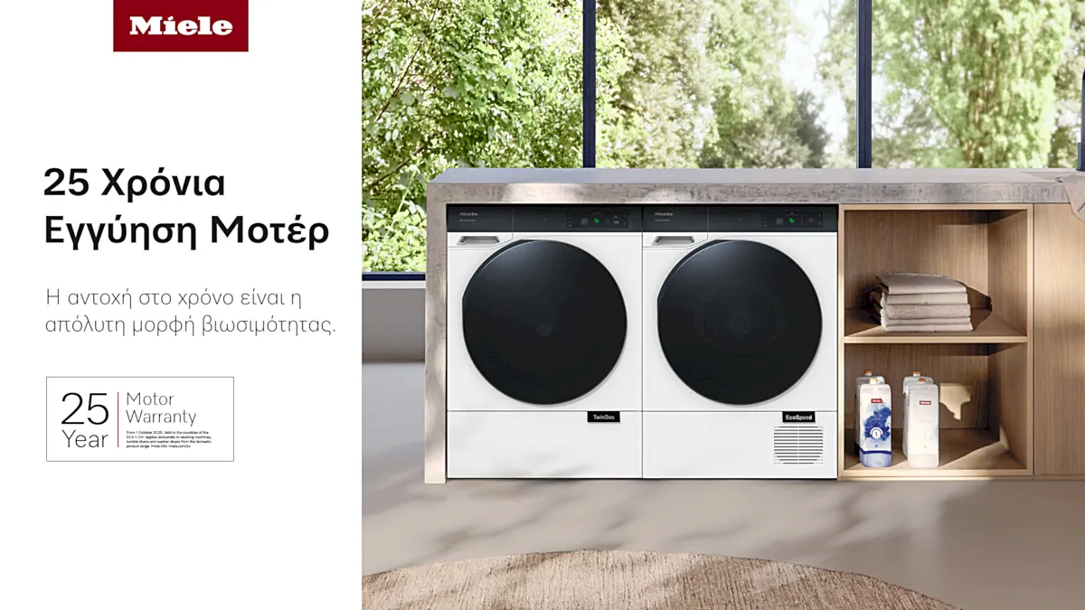 Η Miele, ο παγκόσμιος ηγέτης στον τομέα των premium οικιακών συσκευών, εισάγει στην ελληνική αγορά μία επαναστατική 25ετή εγγύηση μοτέρ σε όλα τα πλυντήρια και στεγνωτήρια. Με αυτή την πρωτοβουλία, η Miele αναδεικνύει περαιτέρω τη δέσμευσή της για αξιοπιστία, μακροζωία και υψηλή αξία για τους καταναλωτές.