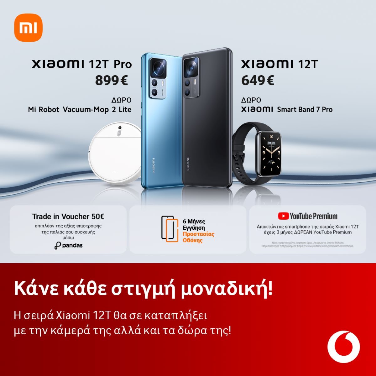 Με κάθε αγορά Xiaomi 12Τ από τις 13/10 μέχρι και τις 23/10 όλοι παίρνουν δώρο το Xiaomi Smart Band 7 Pro αξίας 119€ και με κάθε Xiaomi 12Τ Pro δώρο τη σκούπα Mi Robot Vacuum Mop 2 Lite αξίας 229€, καθώς και 6 μήνες εγγύηση προστασίας οθόνης και 3 μήνες δωρεάν YouTube Premium.