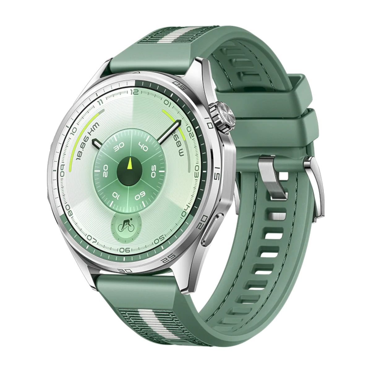 Η Huawei συνεχίζει να επενδύει σε μια premium εικόνα για τη σειρά GT. Το νέο WATCH GT 6 46 mm, συμβατό με iOS και Android, έρχεται με ανοξείδωτη κάσα και λουράκι υφασμάτινο και συνθετικό – σε πράσινη απόχρωση (wooven green) στην περίπτωση του δείγματός μας.