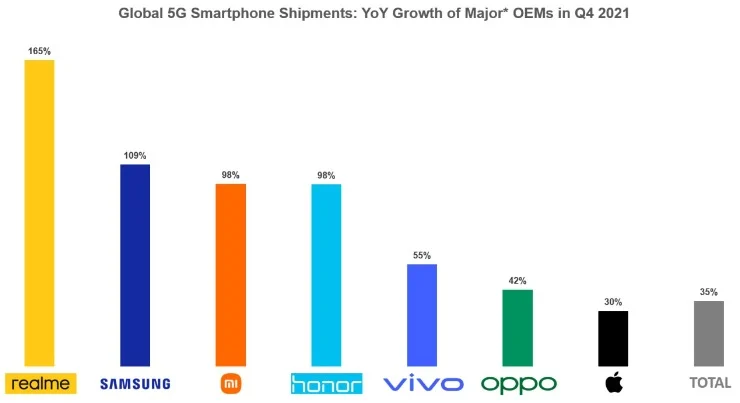Σύμφωνα με την τελευταία έκθεση της Counterpoint Research, οι αποστολές 5G της realme έχουν αυξηθεί περισσότερο σε σύγκριση με όλες τις μεγάλες επωνυμίες smartphone – με αύξηση της τάξης του 165% σε ετήσια βάση, το τέταρτο τρίμηνο του 2021. Η ταχεία ανάπτυξη τροφοδοτήθηκε από την επέκταση της εταιρείας σε χώρες της Δυτικής Ευρώπης όπως η Ιταλία, Ισπανία, Γαλλία, Ηνωμένο Βασίλειο και Ελβετία, σε καθεμία από τις οποίες είναι η ταχύτερα αναπτυσσόμενη μάρκα χάρη στη σειρά GT και το 8 5G.