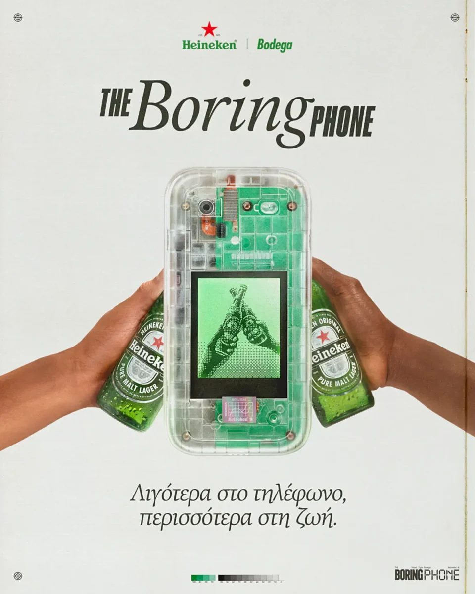 Η Heineken, σε συνεργασία με το Brand Bodega, experts στο street culture, κυκλοφόρησε το «The Boring Phone» – μια συλλεκτική, ανατρεπτική συσκευή που ήρθε για να γίνει ένα πολυπόθητο gadget. Η περιορισμένης έκδοσης σειρά «dumb» τηλεφώνων, ειδικά σχεδιασμένων με μειωμένες τεχνολογικές δυνατότητες, δημιουργήθηκε για να ενθαρρύνει τους ανθρώπους να απολαύσουν αυθεντικές συνδέσεις στις βραδινές τους εξόδους, αποσυνδεόμενοι από τα smartphones τους.