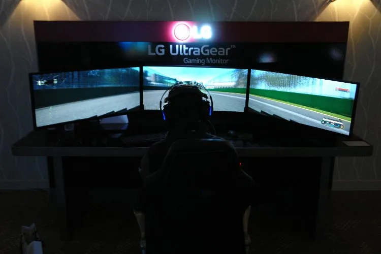 Θεαματικό σύστημα gaming υλοποιημένο με τρεις κυρτές οθόνες 34UC79G, 21:9, συνδεδεμένες μεταξύ τους. Η συνολική ανάλυση της εικόνας του συστήματος ήταν 7.680×3240. 7680 x 3240. (φωτό: Electronicanto)