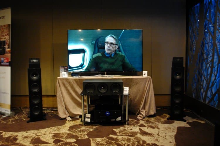 To πληρέστερο σύστημα Home Theater της έκθεσης, υλοποιημένο με την 4K ULED TV Hisense 65U7A, τον Marantz SR7013, έναν ραδιοενισχυτή 9.2 καναλιών, 4K Ultra HD με IMAX Enhanced, Dolby Atmos, Auro-3D, HEOS, AirPlay 2 και Alexa Voice. Τα ηχεία είναι της KEF, σειρά Q. Στην άνω όψη των κύριων ηχείων Q750, βρίσκεται το ηχείο για Dolby Atmos, Q50a. Q50a είναι τοποθετημένα και στην άνω πλευρά των ηχείων surround (δεν διακρίνονται στην εικόνα). (φωτό: Electronicanto)
