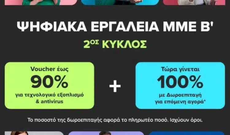 Την επιδότηση voucher έως 90% για απόκτηση τεχνολογικού εξοπλισμού και λογισμικού antivirus, αλλά και επιπλέον δωροεπιταγή1 ίσης αξίας με το 100% του πληρωτέου από τους Δικαιούχους ποσού (για επόμενη αγορά), μπορούν να εξαργυρώσουν στην COSMOTE TELEKOM και τον ΓΕΡΜΑΝΟ οι μικρομεσαίες επιχειρήσεις (ΜΜΕ) και οι ελεύθεροι επαγγελματίες που συμμετέχουν στο πρόγραμμα «Ψηφιακά Εργαλεία ΜMΕ Β’», της Δράσης «Ψηφιακός Μετασχηματισμός Μικρομεσαίων Επιχειρήσεων».